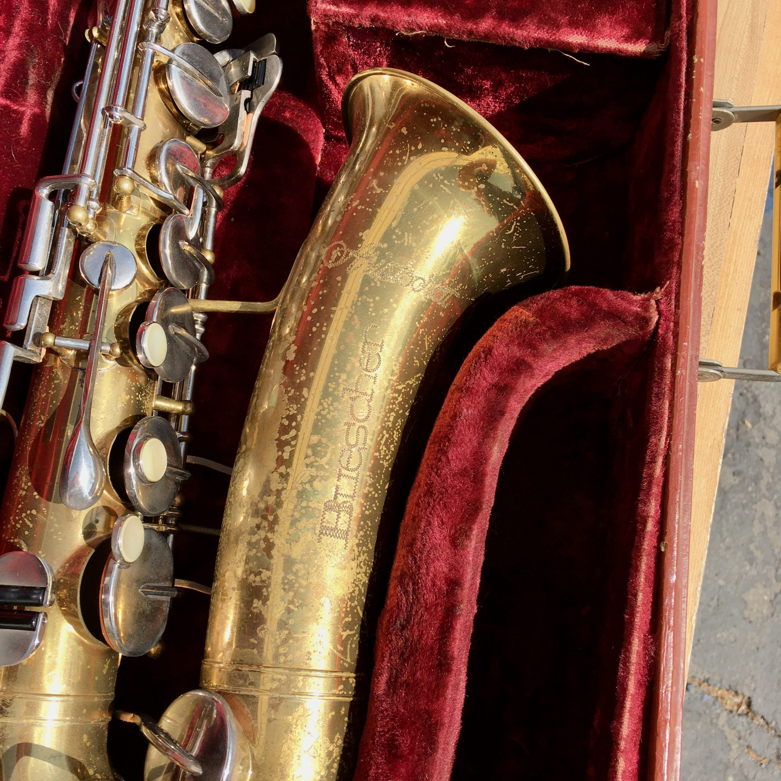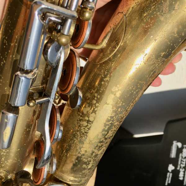 This saxophone is in good condition and has all the hallmarks of a classic Buescher saxophone. There are some blemishes in the finish, but the pads and keywork are in great shape. The instrument was recently serviced and is in good playing condition. The hard-shell carry case comes with the instrument and is an essential piece of Buescher history.