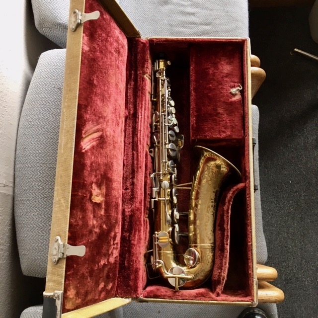 This sax has been completely overhauled and comes with a vintage tweed case with a flashy red interior. Contact Adam’s Music for more information about this Buescher 400 alto saxophone.