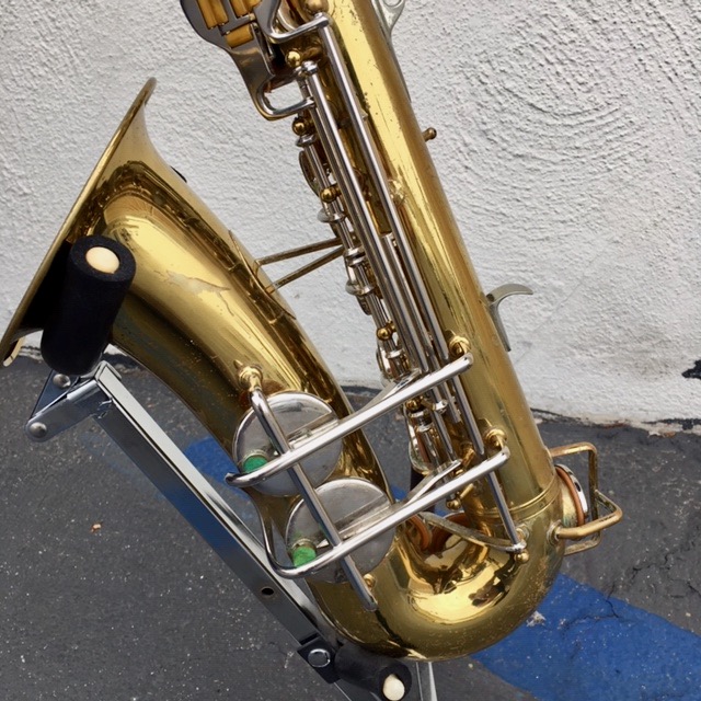 This sax comes with an under-slung octave key, which is desirable on alto saxophones of this vintage. The exterior has a classic lacquer finish with a brilliant nickel-plated keywork, and all of the long rods are made from nickel silver. The widened bell brings clarity to the lower register while preserving the brilliant tone quality. Here’s a video demonstration of a Buescher alto saxophone from the same era.