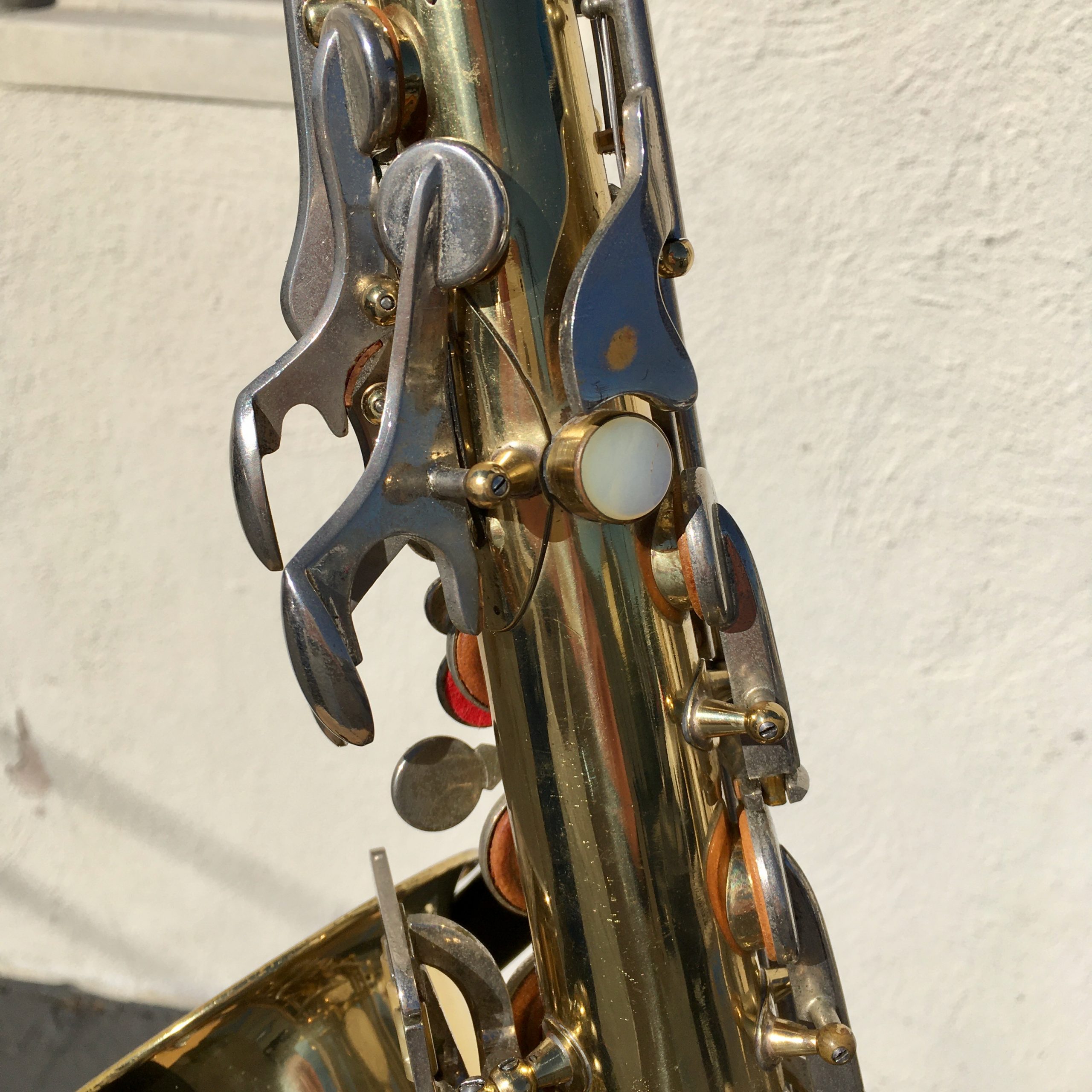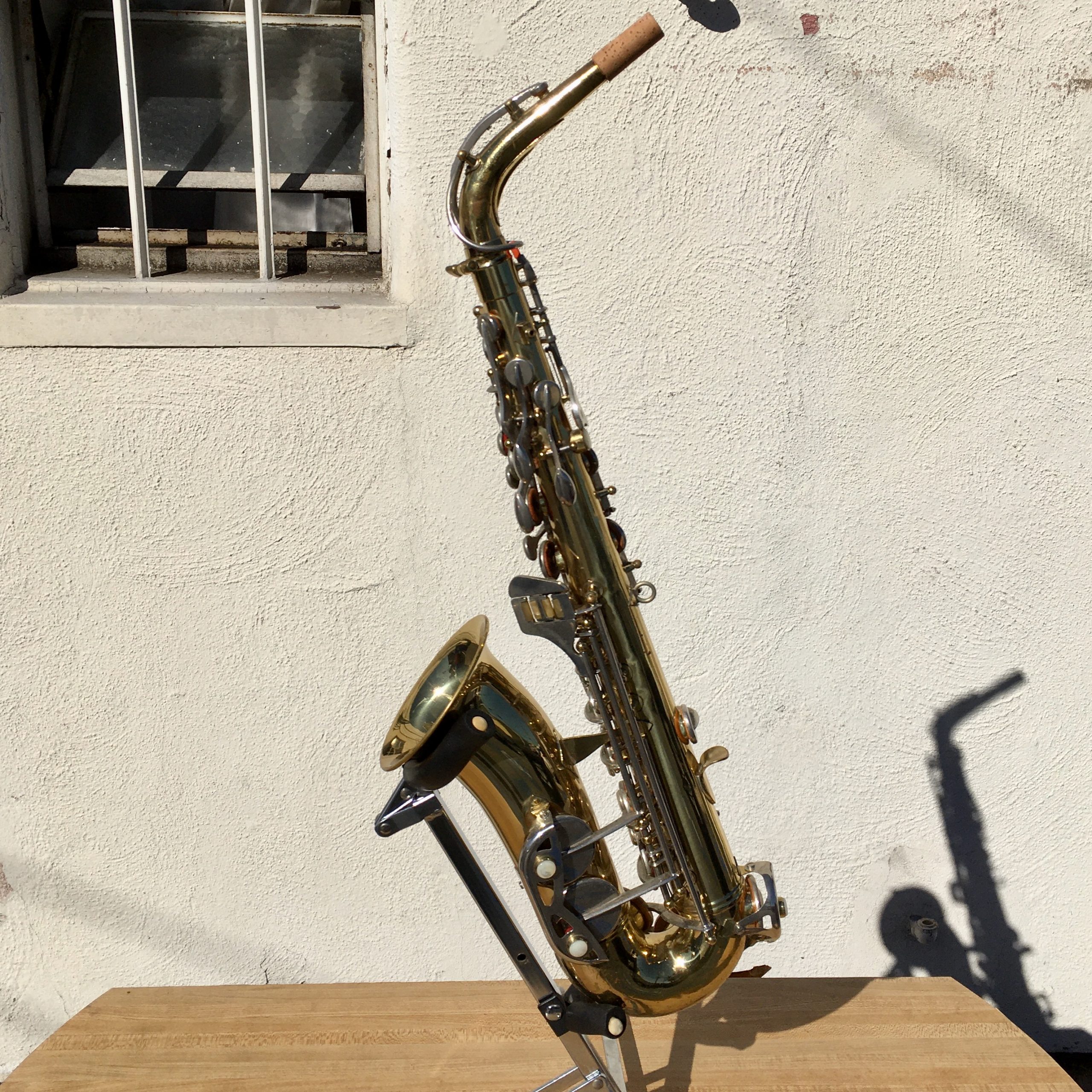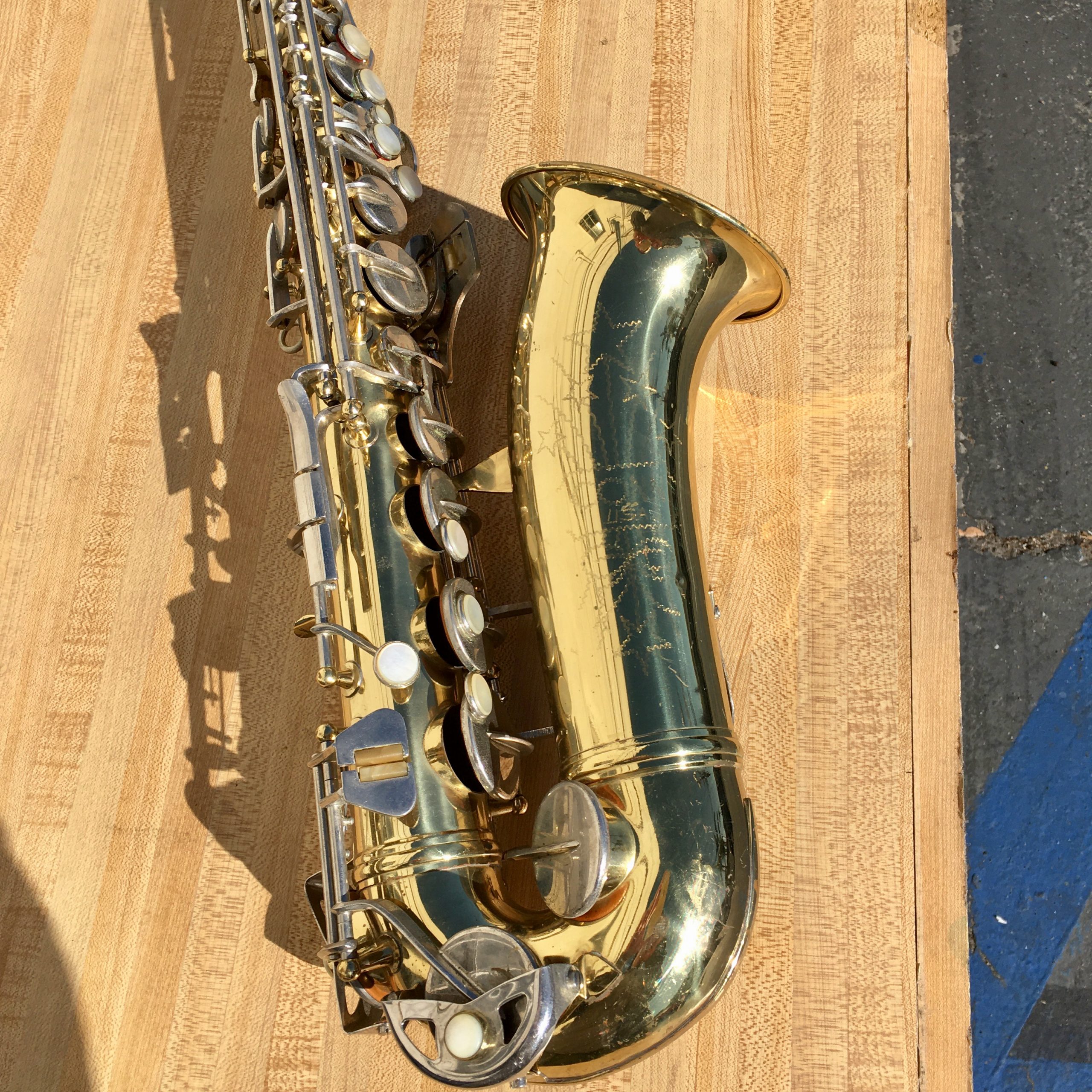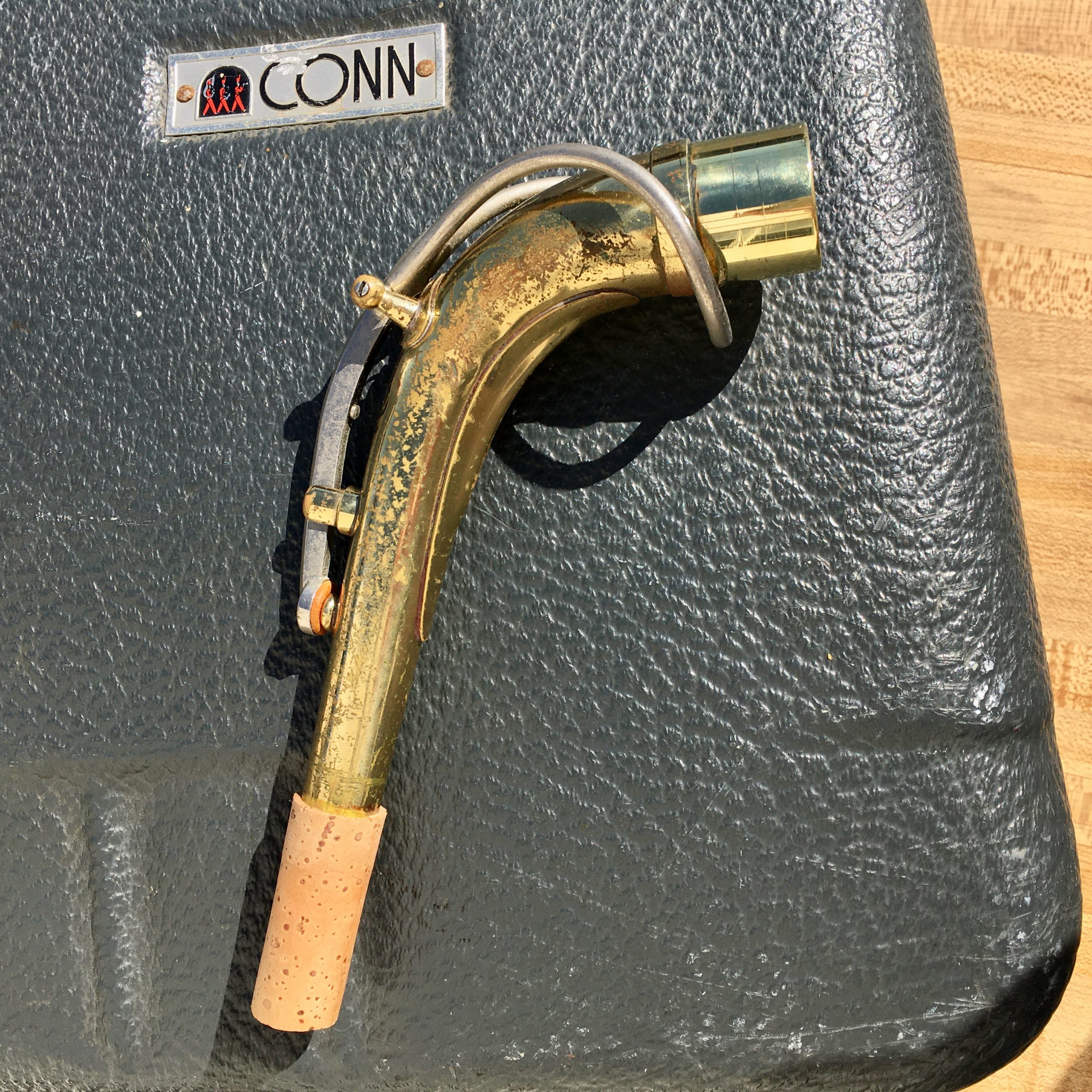 Based on the serial number, this Conn Shooting Star was manufactured in 1968. Despite its age, this sax is in good playing condition. There are some minor blemishes in the lacquer and dings on the body. The horn was recently serviced to ensure the keywork, pads, and mechanisms are all in working order. The saxophone has a strong, but balanced sound. The sax also comes with its original carrying case, which is in good condition for its age.