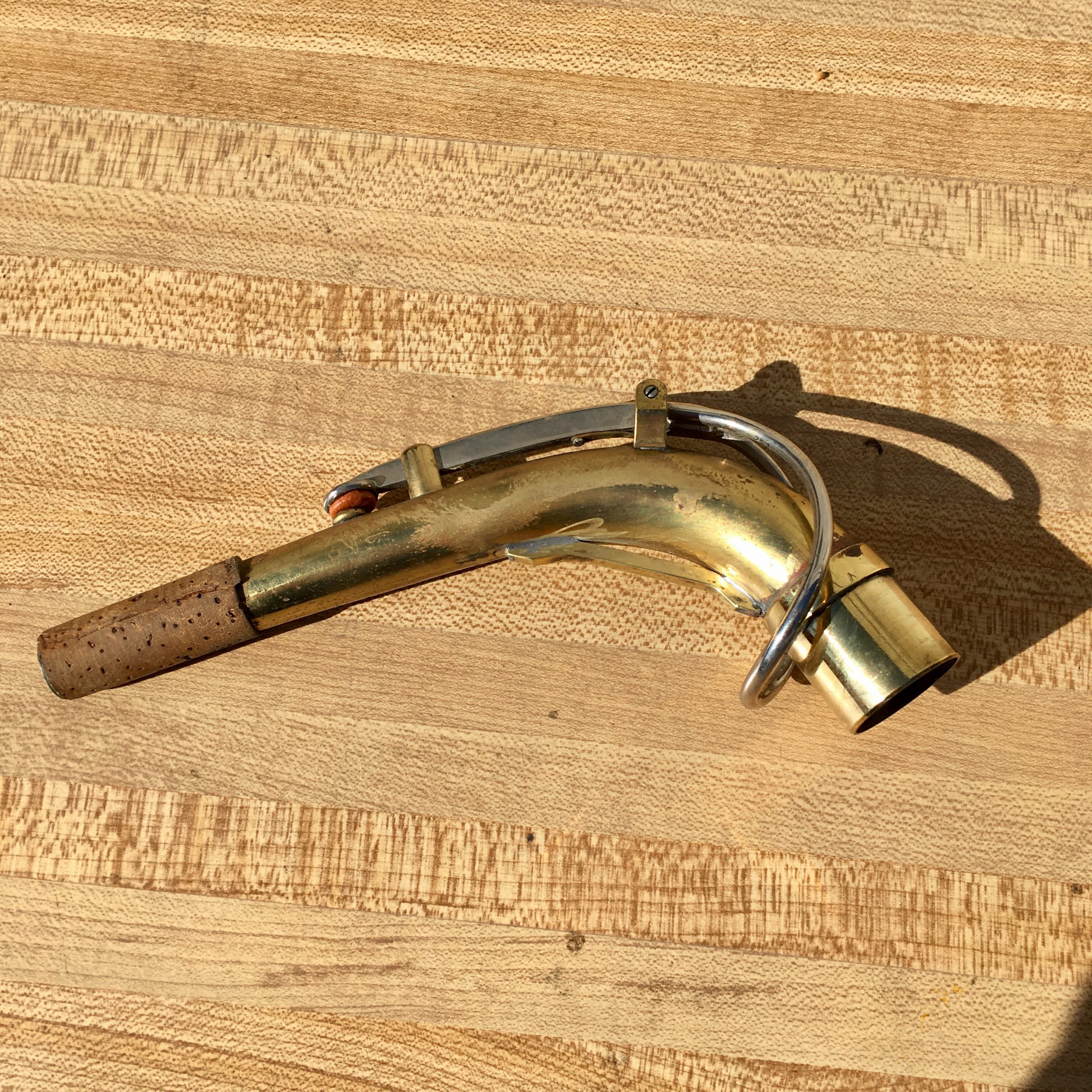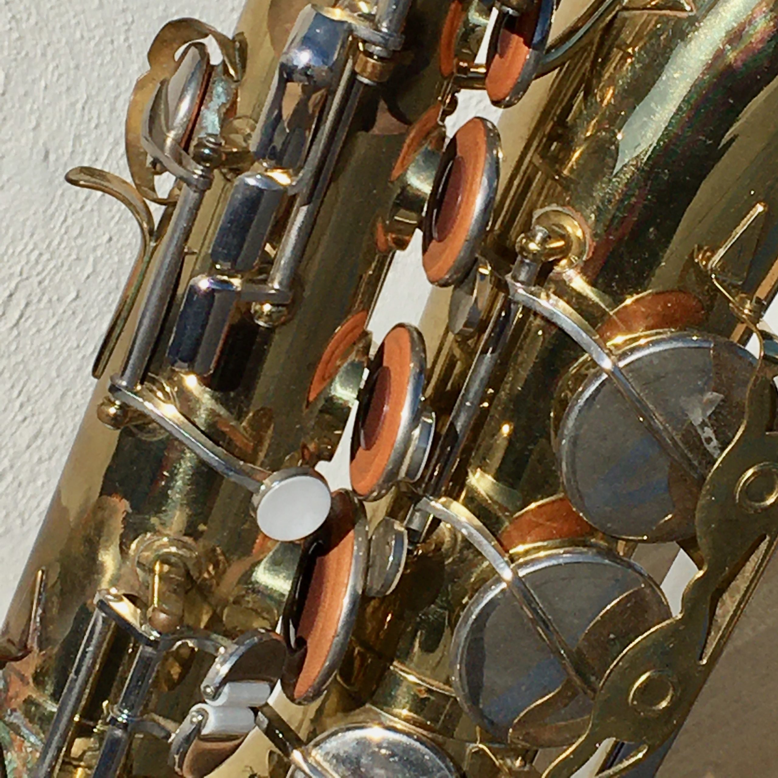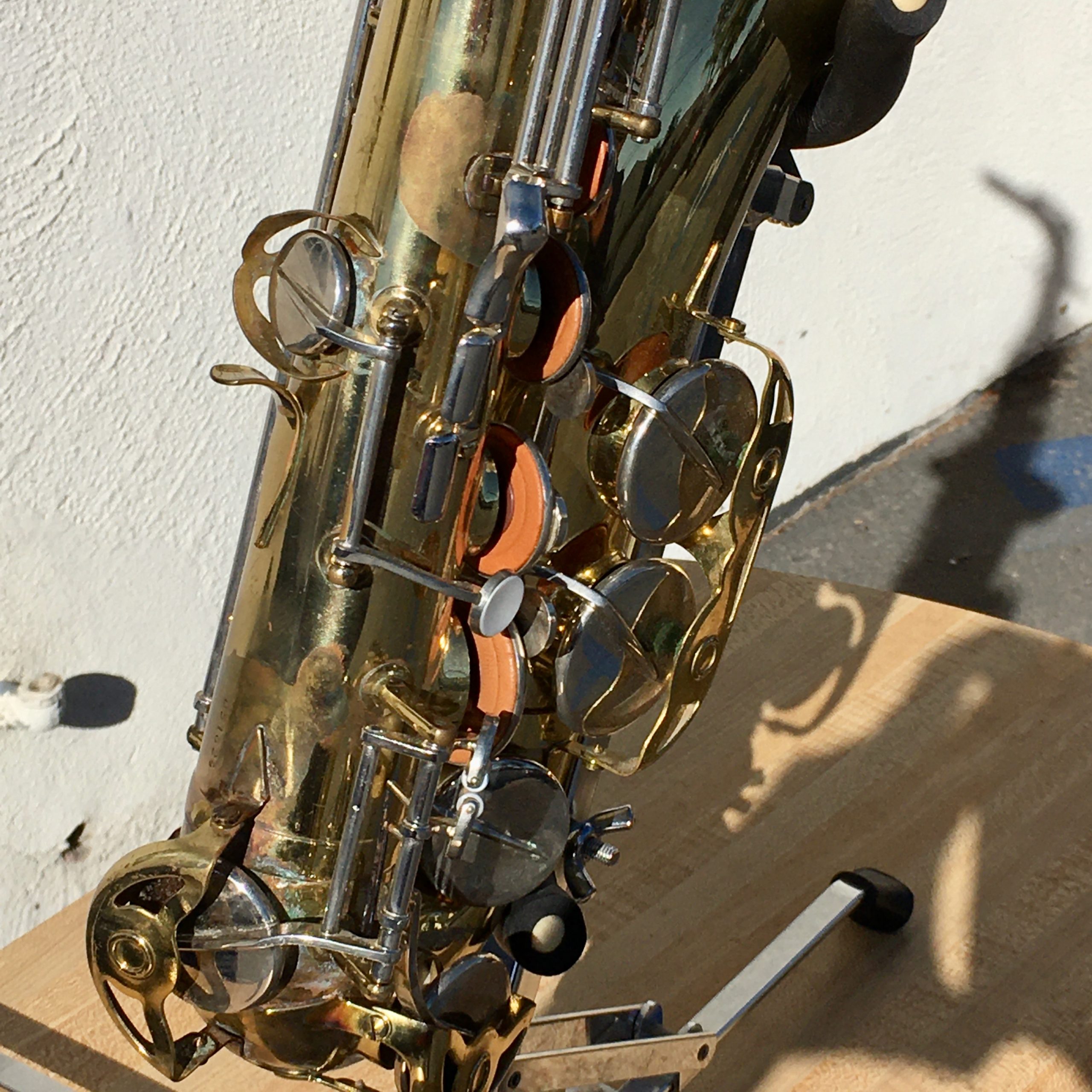This Olds Parisian Ambassador Sax is in good condition. There are some blemishes in the finish on various parts of the saxophone. Some blemishes are from past soldering repairs. There are no dents, and the instrument is in good playing condition. It also comes with a Jupiter hard-shell case. Although the case isn’t original, it’s appropriate for this instrument.